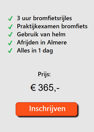 Je kunt bij ons terecht voor de bromfietsrijopleiding en het praktijkexamen bromfiets in Almere. Ben je nog niet geslaagd bent voor het theorie examen of nog (net) geen 16 jaar? Ook dan kun je je alvast inschrijven voor een bromfiets examen.